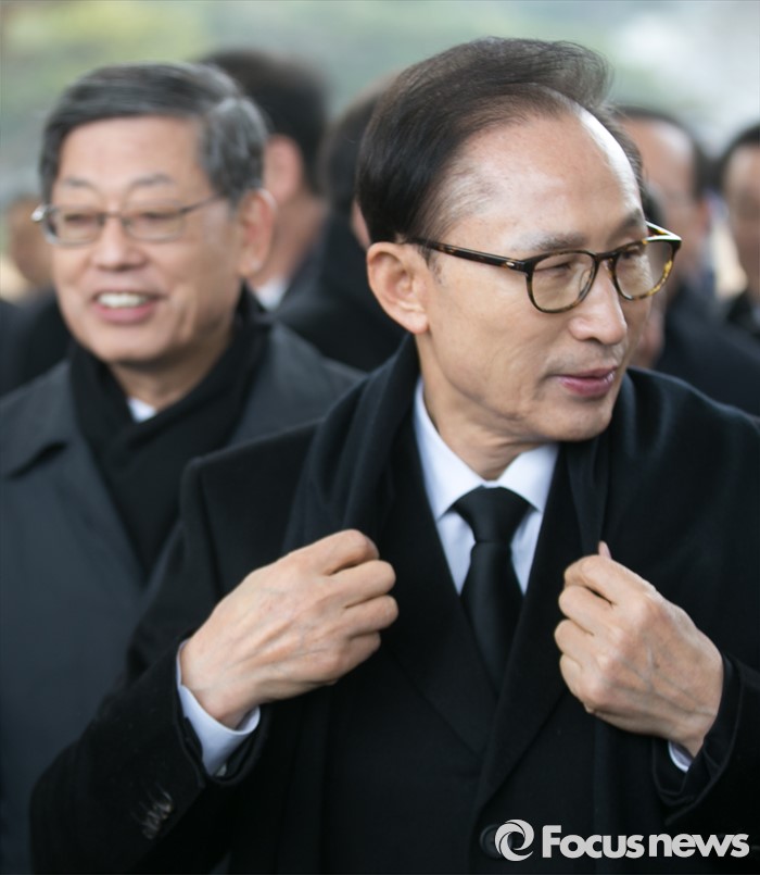 (서울=포커스뉴스) 병신년(丙申年) 새해 첫 날인 1일 오전 동작구 국립서울현충원에서 현충탑 참배를 마친 이명박 전 대통령이 이동하고 있다. 왼쪽은 김황식 전 국무총리.