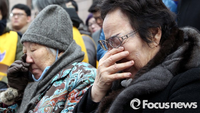 한편 일한의원연맹은 지난해 7월 한국 측 한일의원연맹과 발표한 공동성명에서 "피해 당사자들의 명예 회복과 마음의 고통을 치유할 수 있는 조치를 시급히 강구하도록 노력하겠다"고 밝힌 바 있다.(서울=포커스뉴스) 30일 오후 서울 종로구 일본대사관 앞에서 열린 '1211차 수요집회'에 참석한 위안부 피해자 길원옥(왼쪽부터), 이용수 할머니를 비롯한 참가자들이 일본 정부의 공식 사죄를 촉구 중 눈물을 닦고 있다. 2015.12.30 김흥구 기자