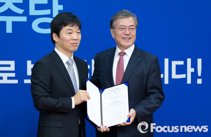(서울=포커스뉴스) 문재인 더불어민주당 대표가 3일 오후 김병관 웹젠 이사회 의장으로부터 지역당원 입당원서를 전달 받고 있다.