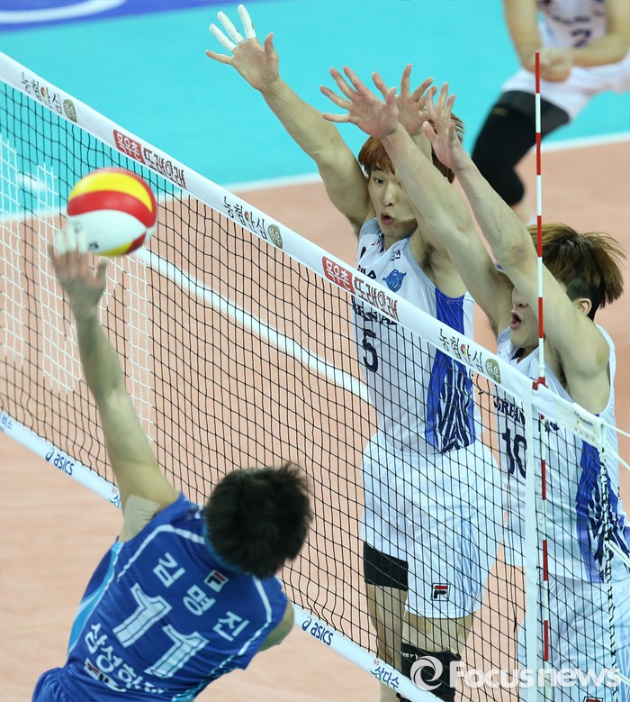 (인천=포커스뉴스) 3일 인천 계양체육관에서 열린 '2015-2016NH농협 V-리그' 남자부 대한항공-삼성화재 경기에서 대한항공 최석기(5)와 정지석이 삼성화재 김명진의 스파이크에 블로킹을 대고 있다.