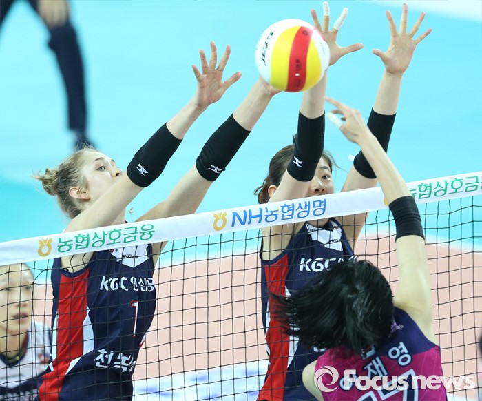 (인천=포커스뉴스) 3일 인천 계양체육관에서 열린 '2015-2016NH농협 V-리그' 여자부 흥국생명-KGC인삼공사 경기에서 흥국생명 이재영이 KGC인삼공사 헤일리와 문명화의 이중 블로킹에 연타 공격하고 있다.