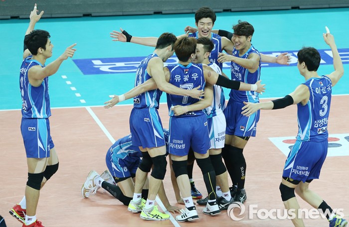 (인천=포커스뉴스) 3일 인천 계양체육관에서 열린 '2015-2016NH농협 V-리그' 남자부 대한항공-삼성화재 경기에서 1,2세트를 내준뒤 3-2로 역전승한 삼성화재 선수듣이 경기를 마치고 서로 얼싸 안으며 승리의 기쁨을 만끽하고 있다.