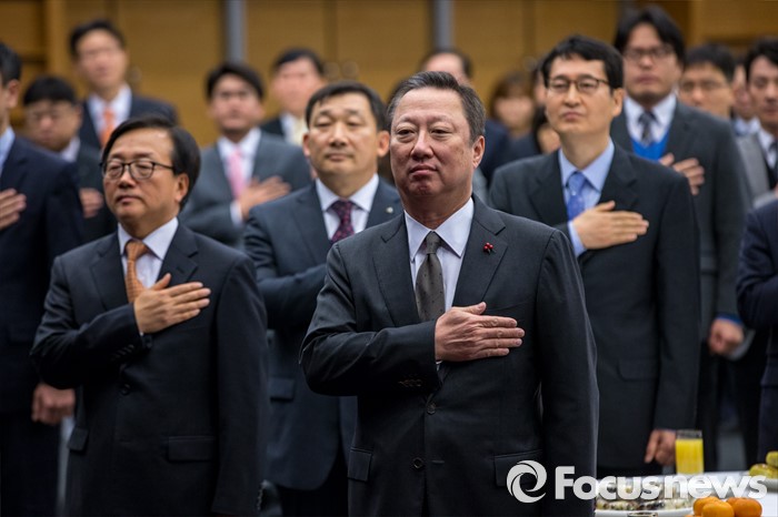 (서울=포커스뉴스) 박용만 대한상공회의소 회장이 4일 오전 서울 중구 대한상공회의소에서 열린 신녀인사회에 자리해 국민의례를 하고 있다.