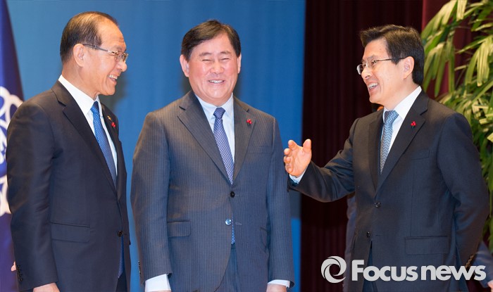 (세종=포커스뉴스) 황교안(오른쪽부터) 국무총리가 4일 오전 세종시 정부세종청사 대강당에서 열린 2016년 정부시무식에서 최경환 경제부총리 겸 기획재정부장관, 황우여 사회부총리겸 교육부장관과 대화를 나누고 있다.
