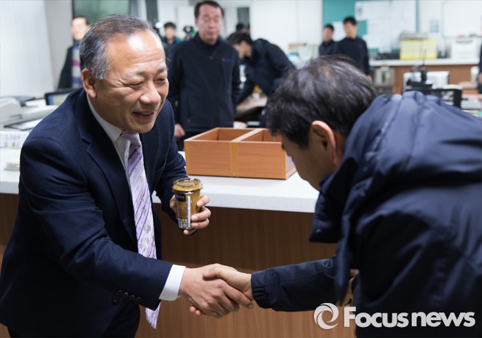 (서울=포커스뉴스) 이정원(오른쪽) 서울메트로 사장이 4일 오전 서울 군자차량기지에서 직원들에게 커피를 나눠주며 격려하고 있다.