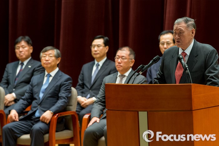 (서울=포커스뉴스) 4일 오전 서울 서초구 현대자동차 본사 대강당에서 열린 2016년도 시무식에 참석한 정몽구 현대차그룹 회장이 신년사를 하고 있다.