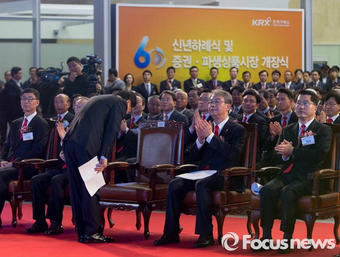(서울=포커스뉴스) 병신년(丙申年) 새해 첫 증시 개장일인 4일 오전 영등포구 서울 여의도 거래소 2016년도 증권·파생상품시장 60주년 개장식에서 최경수 한국거래소 이사장이 내, 외빈들에게 인사를 하고 있다. .