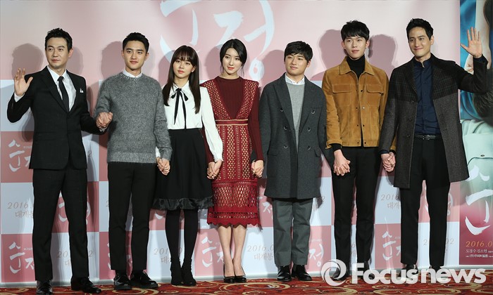 (서울=포커스뉴스) 4일 오전 서울 광진구 롯데시네마 건대입구점에서 열린 영화 '순정' 제작보고회에 자리한 출연배우들이 사진촬영을 하고 있다. 왼쪽부터 배우 박용우, 도경수, 김소현, 주다영, 이다윗, 연준석, 박해준이 포토타임을 갖고 있다.