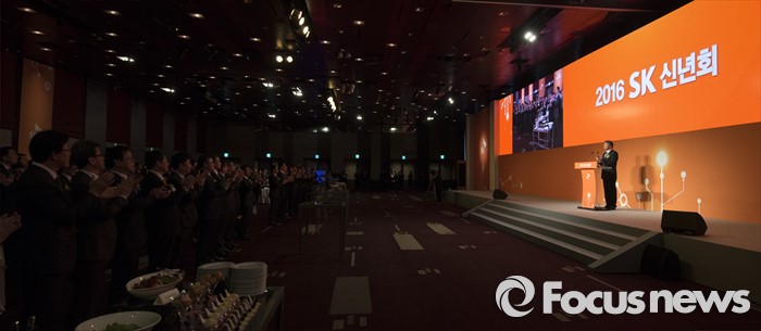 (서울=포커스뉴스) 최근 혼외로 아이를 둔 사실을 고백해 파문을 일으키고 있는 최태원 SK그룹 회장이 4일 오전 서울 광장동 워커힐호텔에서 열린 그룹 신년회에 참석해 신년사를 하고 있다.