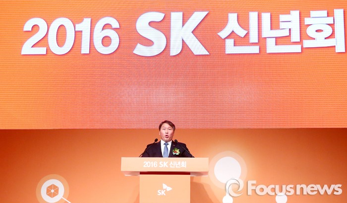 (서울=포커스뉴스) 최근 혼외로 아이를 둔 사실을 고백해 파문을 일으키고 있는 최태원 SK그룹 회장이 4일 오전 서울 광장동 워커힐호텔에서 열린 그룹 신년회에 참석해 신년사를 하고 있다.