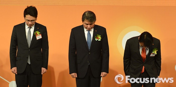 (서울=포커스뉴스) 최근 혼외로 아이를 둔 사실을 고백해 파문을 일으키고 있는 최태원(가운데) SK그룹 회장이 4일 오전 서울 광장동 워커힐호텔에서 열린 그룹 신년회에 참석해 인사하고 있다.