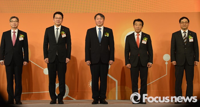 (서울=포커스뉴스) 최근 혼외로 아이를 둔 사실을 고백해 파문을 일으키고 있는 최태원(가운데) SK그룹 회장이 4일 오전 서울 광장동 워커힐호텔에서 열린 그룹 신년회에 참석해 임원들과 함께 무대에 올라 기념촬영을 하고 있다.