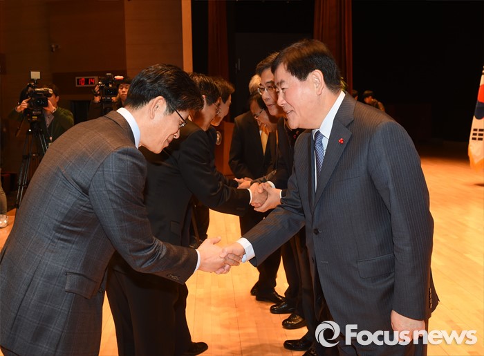 (세종=포커스뉴스) 최경환 경제부총리 겸 기획재정부장관이 4일 오전 세종시 정부세종청사 대강당에서 열린 기재부 시무식에 참석해 직원들과 신년인사를 하고 있다. <사진제공=기획재정부>