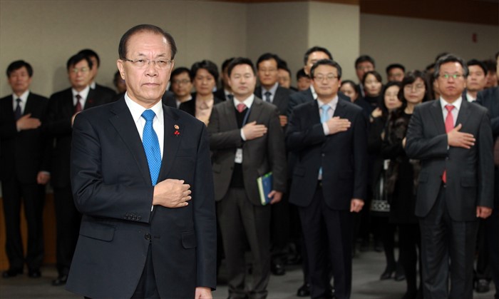 (세종=포커스뉴스) 황우여 사회부총리 겸 교육부장관이 4일 오전 세종시 정부세종청사 교육부 대회의실에서 열린 시무식에서 국기에 대한 경례를 하고 있다. <사진제공=교육부>