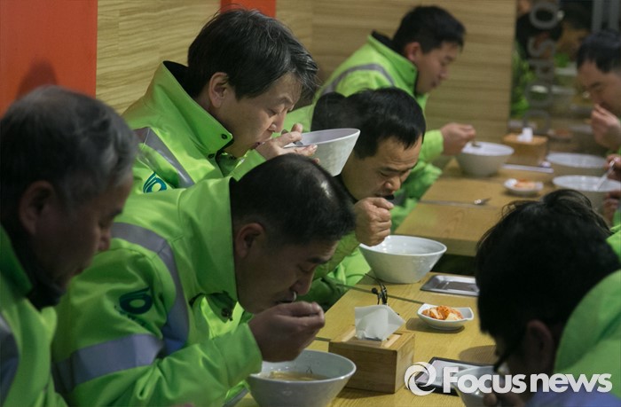 (서울=포커스뉴스) 신당 창당을 추진 중인 안철수 무소속 의원이 5일 오전 서울 영등포역 동부광장 인근에서 환경미화원들과 함께 새해맞이 청소를 마친 뒤 분식집에서 어묵탕 식사를 하고 있다.