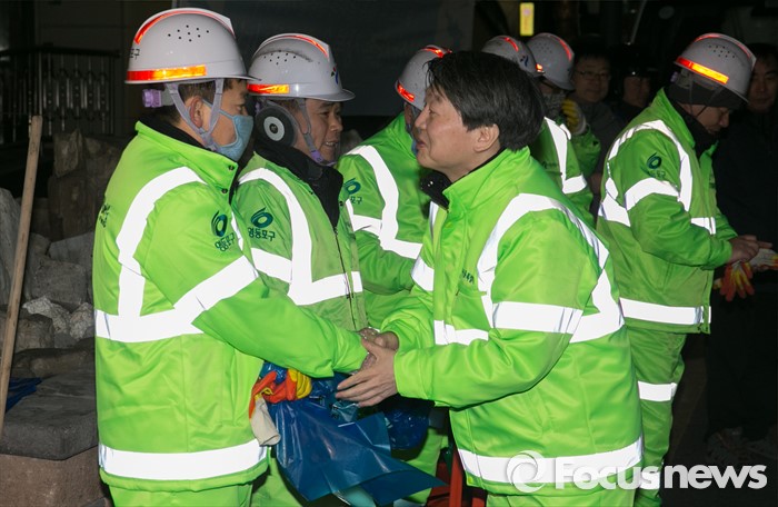 (서울=포커스뉴스) 신당 창당을 추진 중인 안철수 무소속 의원이 5일 오전 서울 영등포역 동부광장 인근에서 새해맞이 청소에 앞서 환경미화원들과 인사하고 있다.