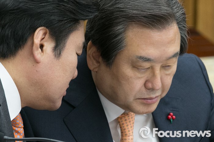 (서울=포커스뉴스) 김무성(오른쪽) 새누리당 대표와 원유철 원내대표가 5일 오전 서울 여의도 국회에서 열린 20대 총선 공약개발본부 발족식에 참석해 논의하고 있다.