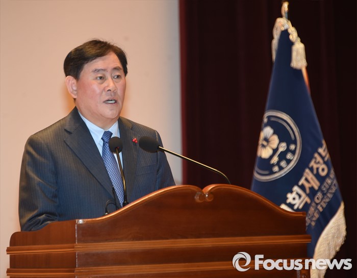 금융사들의 지배구조에 대해서는 "실질적인 주인이 없는 느슨한 지배구조야말로 관치금융, 방만경영, 보신주의의 깊은 뿌리"라고 지적하고 "인터넷 전문은행에 대한 지분한도 완화,금융회사 지배구조법의 차질 없는 시행 등 제도 개선에 박차를 가해야 한다"고 당부했다.(세종=포커스뉴스) 최경환 경제부총리 겸 기획재정부장관이 4일 오전 세종시 정부세종청사 대강당에서 열린 기재부 시무식에 참석해 신년사를 하고 있다. <사진제공=기획재정부>