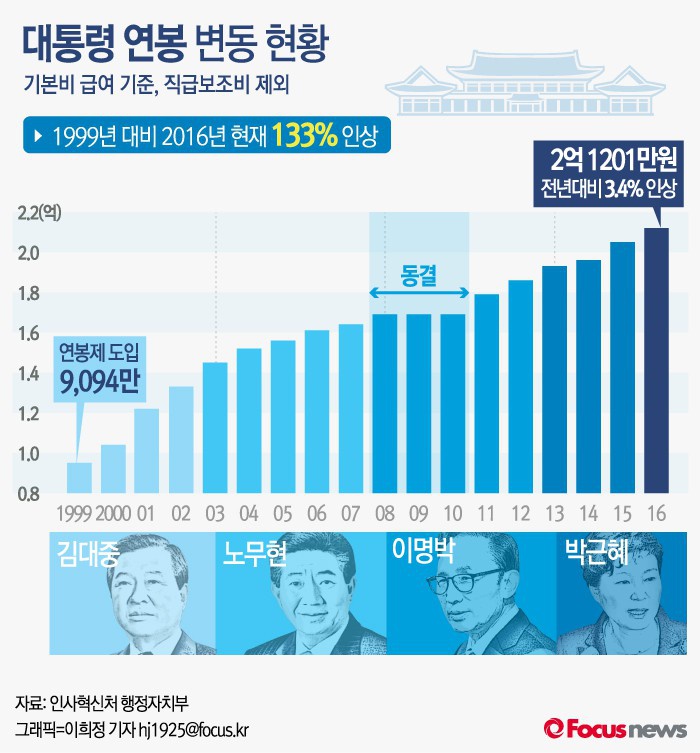 1999년 김대중 대통령 시절 첫 연봉제 도입 후부터 2016년 박근혜 대통령까지 연봉을 그래픽으로 알아 보겠습니다.