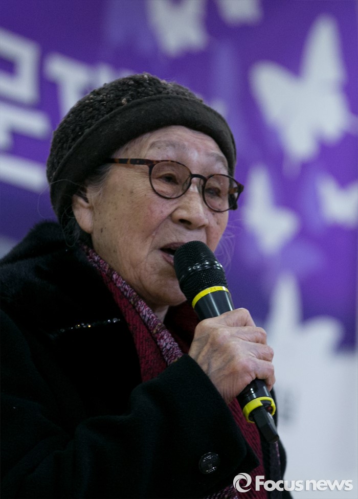 (서울=포커스뉴스) 5일 오후 서울 여의도 국회 의원회관에서 민주사회를 위한 변호사모임, 한국정신대문제대책협의회 등 주최로 열린 긴급진단, 2015년 한일 외교 장관 회담의 문제점 토론회에 참석한 위안부 피해자 김복동 할머니가 회담을 인정할 수 없는 이유에 대해 발언하고 있다.