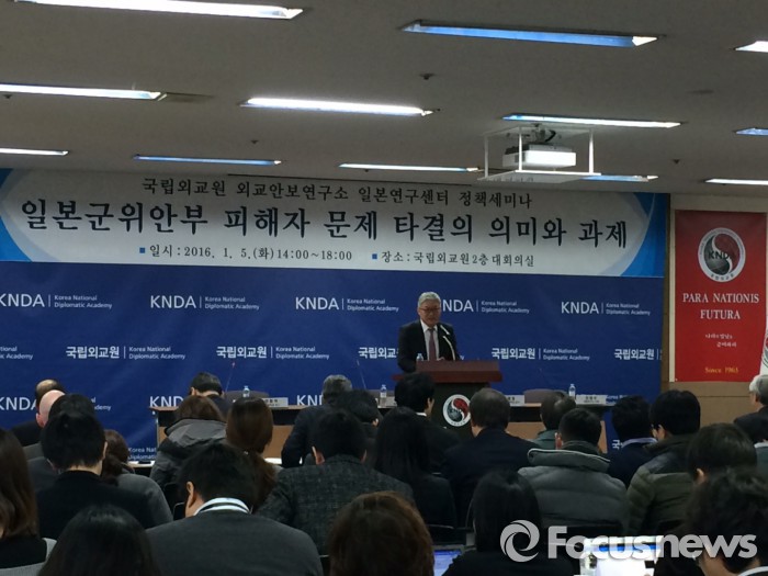 국립외교원 주최로 5일 오후 2시부터 국립외교원 2층 대회의실에서 ‘일본군 위안부 피해자 문제 타결의 의미와 과제’라는 주제로 열린 정책세미나 인사말을 맡은 윤 원장은 한·일 정부의 위안부 문제 협상 타결에 대해 이같이 평가했다.