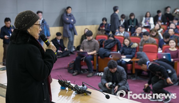 (서울=포커스뉴스) 5일 오후 서울 여의도 국회 의원회관에서 민주사회를 위한 변호사모임, 한국정신대문제대책협의회 등 주최로 열린 긴급진단, 2015년 한일 외교 장관 회담의 문제점 토론회에 참석한 위안부 피해자 김복동 할머니가 회담을 인정할 수 없는 이유에 대해 발언하고 있다.