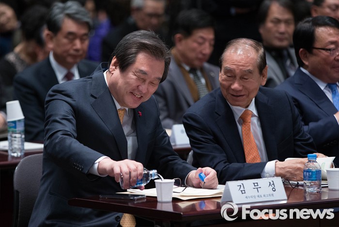 (서울=포커스뉴스) 김무성 새누리당 대표가 5일 오후 서울 중구 프레스센터에서 열린 ‘2016 시민사회 합동 신년회’에 참석, 김진현(오른쪽) 세계평화포럼 이사장과 대화를 나누며 웃고 있다.