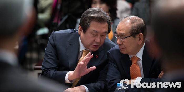 (서울=포커스뉴스) 김무성 새누리당 대표가 5일 오후 서울 중구 프레스센터에서 열린 ‘2016 시민사회 합동 신년회’에 참석, 김진현(오른쪽) 세계평화포럼 이사장과 조용히 대화를 나누고 있다.