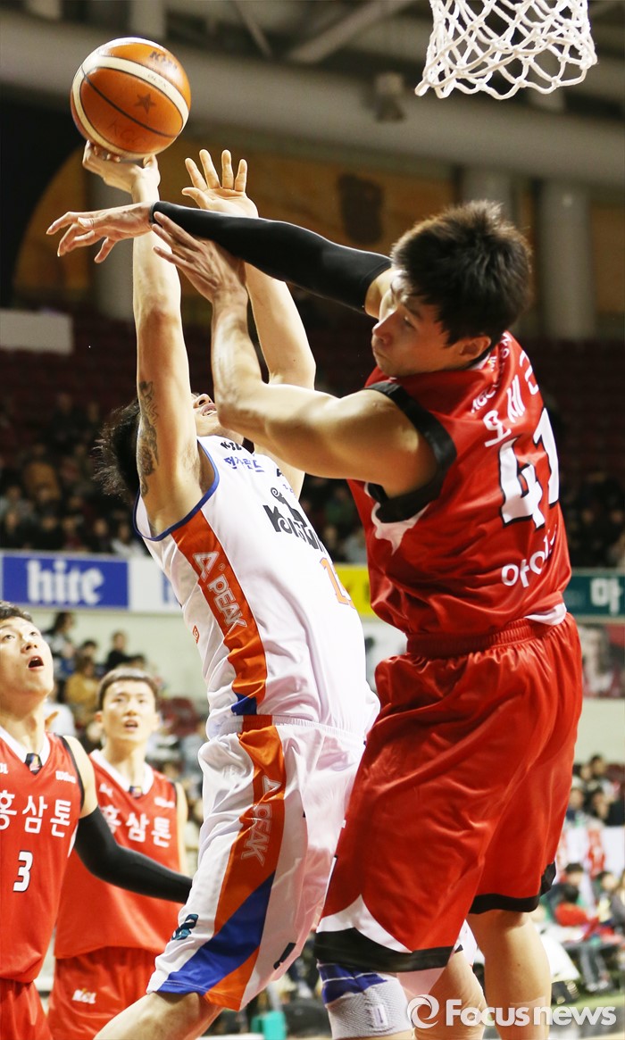 (안양=포커스뉴스) 5일 안양실내체육관에서 열린 2015-2016 프로농구 KGC-전자랜드 경기에서 전자랜드 주태수가 슈팅을 시도하다 KGC 오세근과 충돌하고 있다.