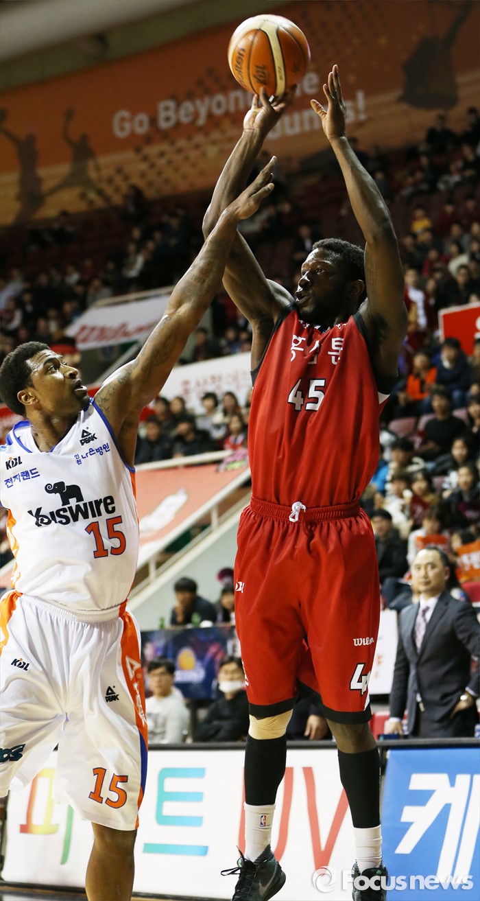 (안양=포커스뉴스) 5일 안양실내체육관에서 열린 2015-2016 프로농구 KGC-전자랜드 경기에서 KGC 마리오 리틀이 전자랜드 포웰의 마크를 받으며 미들슛을 쏘고 있다.