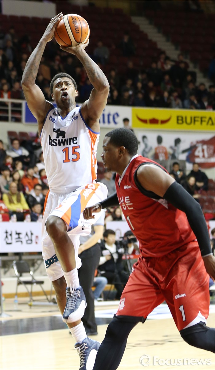 (안양=포커스뉴스) 5일 안양실내체육관에서 열린 2015-2016 프로농구 KGC-전자랜드 경기에서 전자랜드 포웰이 KGC 찰스 로드를 앞에 두고 점프슛을 시도하고 있다.