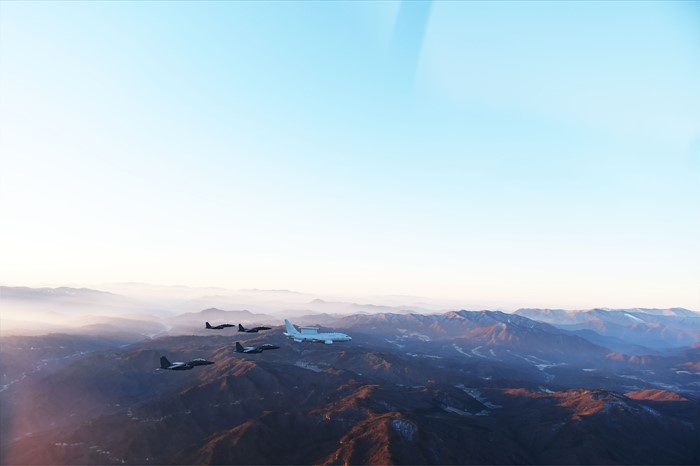 (서울=포커스뉴스) E-737 피스아이와 F-15K 편대가 한반도의 척추인 백두대간의 고산준봉을 따라 비행하고 있다. <사진제공=공군>
