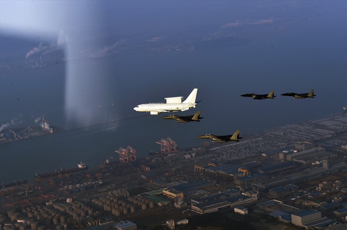 (서울=포커스뉴스) 공군 E-737 피스아이와 F-15K 편대가 대중국 수출입 관문인 평택항 상공을 지나고 있다. <사진제공=공군>