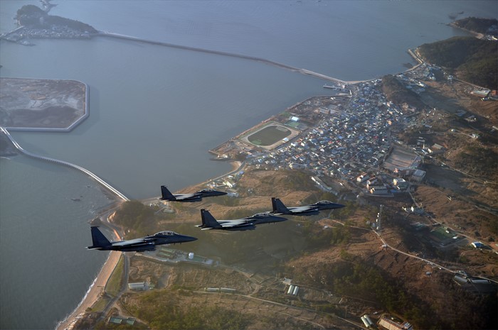 (서울=포커스뉴스) 공군 F-15K 편대가 서해 최북단 영토인 연평도 상공을 초계비행하고 있다. <사진제공=공군>