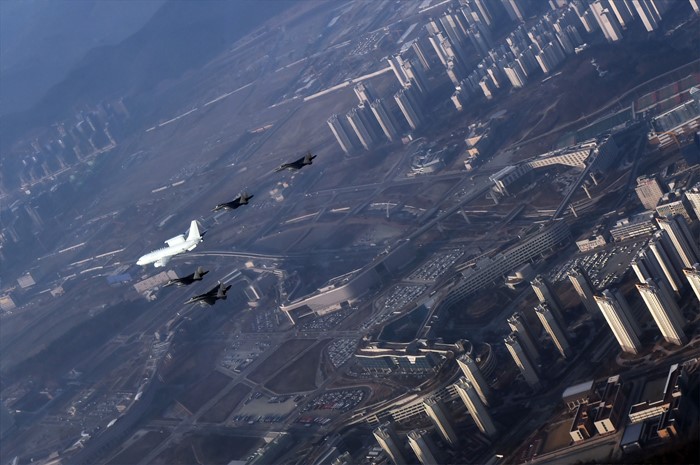 | △ 정부세종청사 상공 지나는 공군 조기경보기와 전투기 편대 |