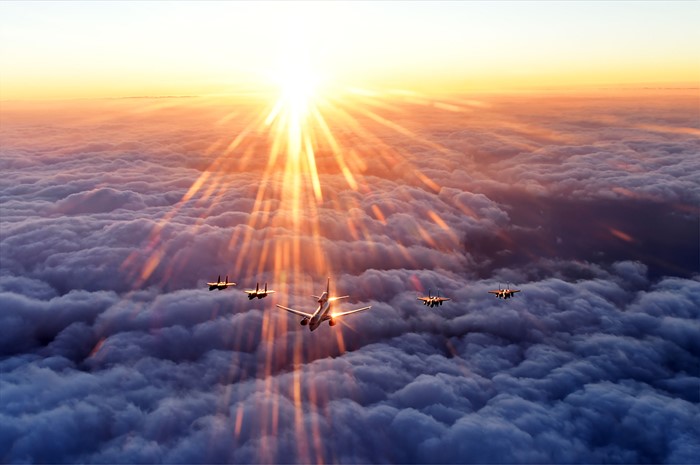 (서울=포커스뉴스) 공군 E-737 피스아이(선두)와 F-15K 편대가 대한민국의 동해안 호미곶 상공에서 일출을 맞이하고 있다. <사진제공=공군>