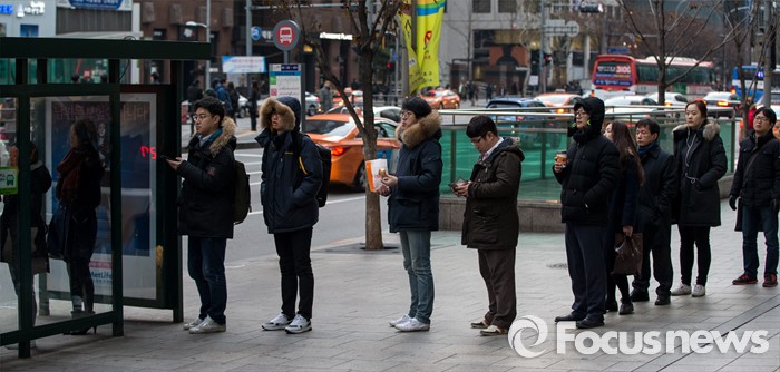 (서울=포커스뉴스) 절기상 소한(小寒)인 6일 오전 서울 강남역 인근에서 직장인들이 영하권 강추위에 두꺼운 외투를 입고 버스를 기다리고 있다.