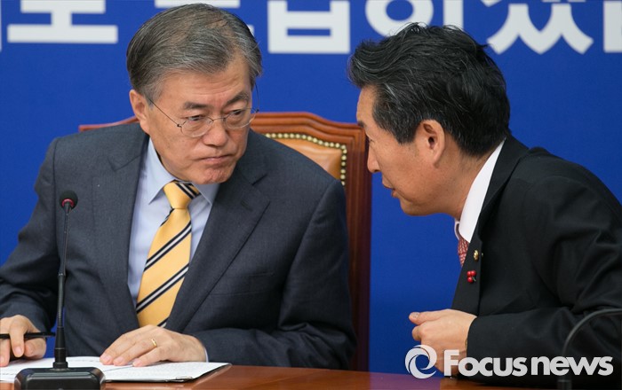 (서울=포커스뉴스) 문재인(왼쪽) 더불어민주당 대표와 정청래 최고위원이 6일 오전 서울 여의도 국회에서 열린 최고위원회의에 참석해 대화하고 있다.