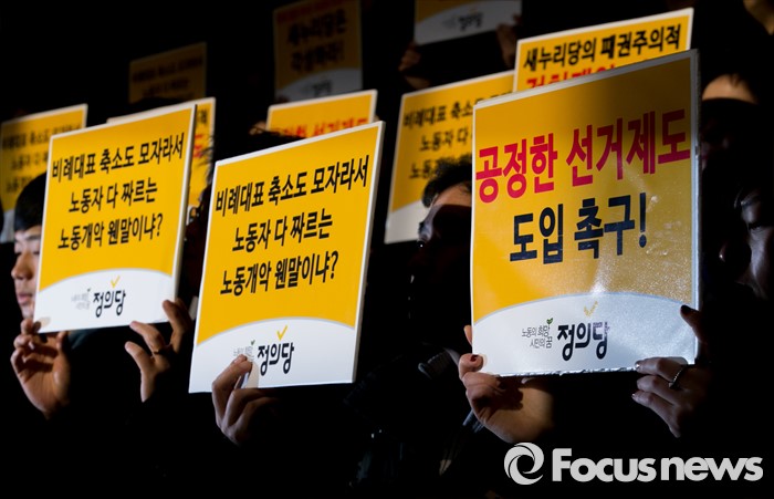 (서울=포커스뉴스) 6일 오전 서울 여의도 국회 로텐더홀 계단에서 심상정 정의당 상임대표 등 지도부 및 의원단이 공정한 선거제도 도입 촉구 및 새누리당 규탄 기자회견을 하고 있다.