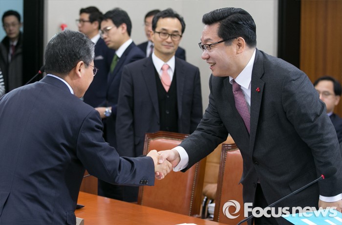 (서울=포커스뉴스) 주형환 산업통상자원부 장관 후보자가 6일 오전 서울 여의도 국회에서 열린 인사청문회에 참석해 여당 의원과 인사하고 있다.