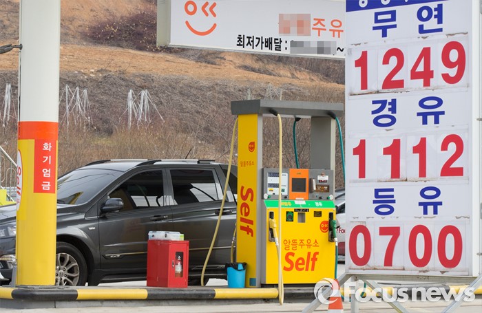 (음성=포커스뉴스) 국제유가 하락으로 휘발윳값이 7년 만에 최저가를 보인 가운데 6일 오전 11시 기준 충북 음성군 감곡면에 위치한 주유소에서 전국 최저가인 리터당 휘발유는 1249원, 경유는 1112원에 판매되고 있다.