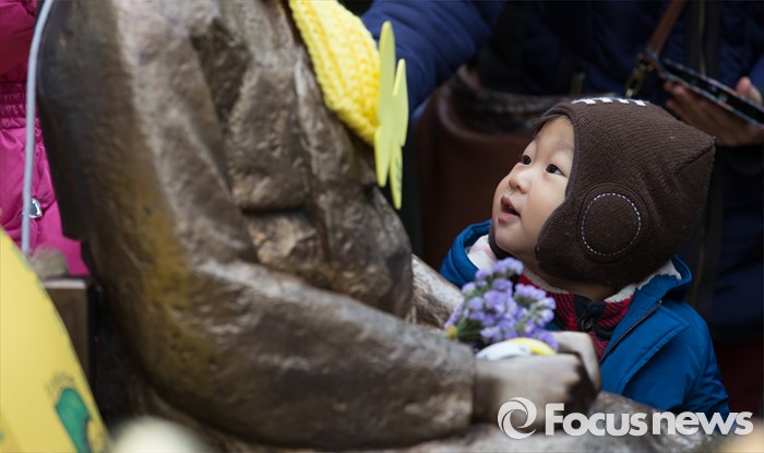 (서울=포커스뉴스) 일본군 위안부 문제해결을 위한 정기수요집회가 제1212차로 24주년을 맞은 6일 오후 서울 종로구 구 일본대사관 앞에서 한 어린이가 소녀상을 바라보고 있다.