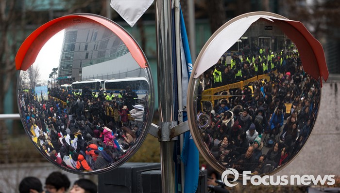 (서울=포커스뉴스) 6일 오후 서울 종로구 구 일본대사관 앞에서 열린 제1212차 일본군 위안부 문제해결을 위한 정기수요집회에 참석한 참가자들의 모습이 거울에 반영되고 있다.
