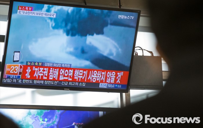 (서울=포커스뉴스) 북한이 첫 수소탄 핵실험을 실시했다고 발표한 6일 오후 서울 서초구 고속버스터미널에서 시민들이 이에 관련된 뉴스특보를 시청하고 있다.
