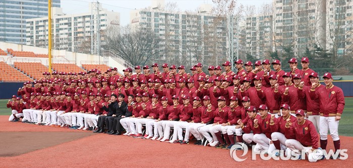 (서울=포커스뉴스) 6일 목동구장에서 열린 프로야구 2016년 넥센 히어로즈 시무식을 마치고 이장석 대표, 염경엽 감독을 비롯한 코칭스탭 및 선수단 전원이 그라운드에 모여 새해의 선전을 다짐하고 있다.