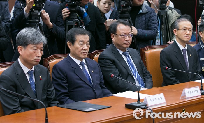 (서울=포커스뉴스) 6일 오후 서울 여의도 국회 새누리당 대표최고위원실에서 열린 북한 핵실험 관련 긴급대책회의에 정부 외교안보 관계부처 차관들이 참석해 있다. 왼쪽부터 황부기 통일부 차관, 황인무 국방부 차관, 한기범 국정원 1차장, 임성남 외교부 1차관.