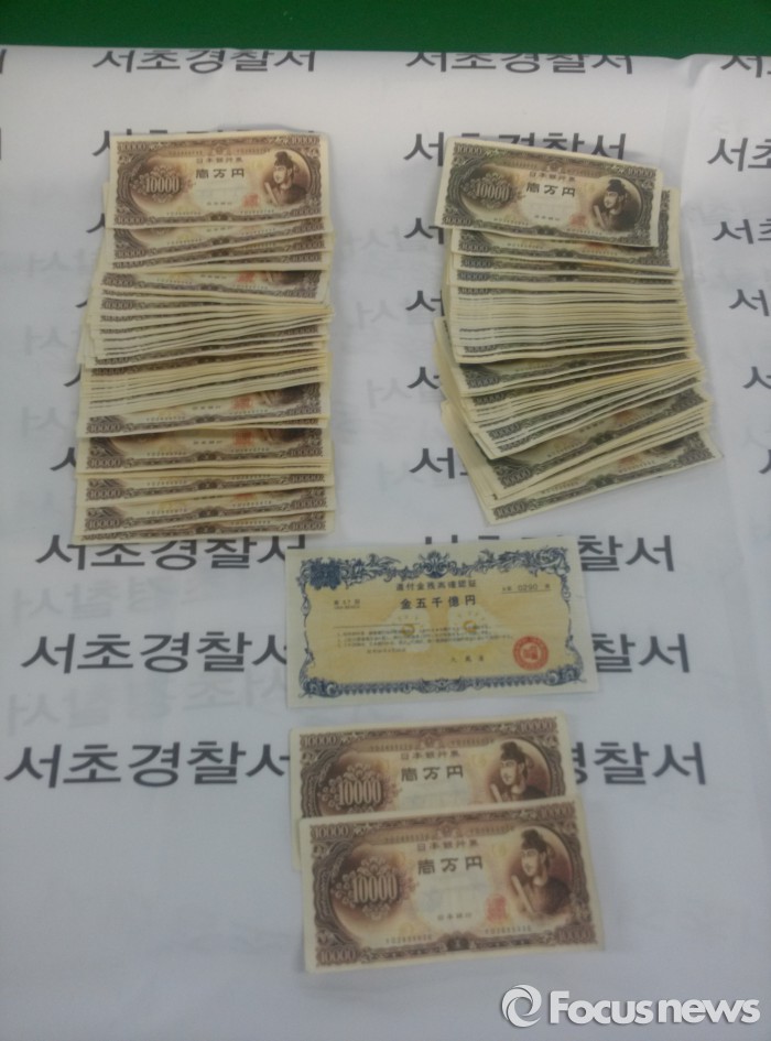 (서울=포커스뉴스) 서울 서초경찰서는 말레이시아에서 위조한 일본 채권과 엔화 5조원 가량을 국내에 유통시키려 한 혐의(통화위조·사기)로 채모(49)씨와 정모(55)씨를 구속했다고 6일 밝혔다.