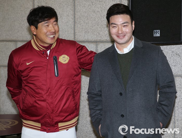 (서울=포커스뉴스) 미국 메이저리그 미네소타 트윈스로 진출한 박병호(오른쪽)가 6일 목동구장에서 열린 2016 넥센 히어로즈 시무식에 참석해 선수들과 인사를 나눴다.