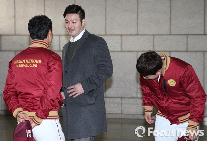 (서울=포커스뉴스) 6일 목동구장에서 열린 2016 넥센 히어로즈 시무식에 참석해 대화중인 박병호에게 지나가던 새로운 주장 서건창이 고개 숙여 인사하고 있다.