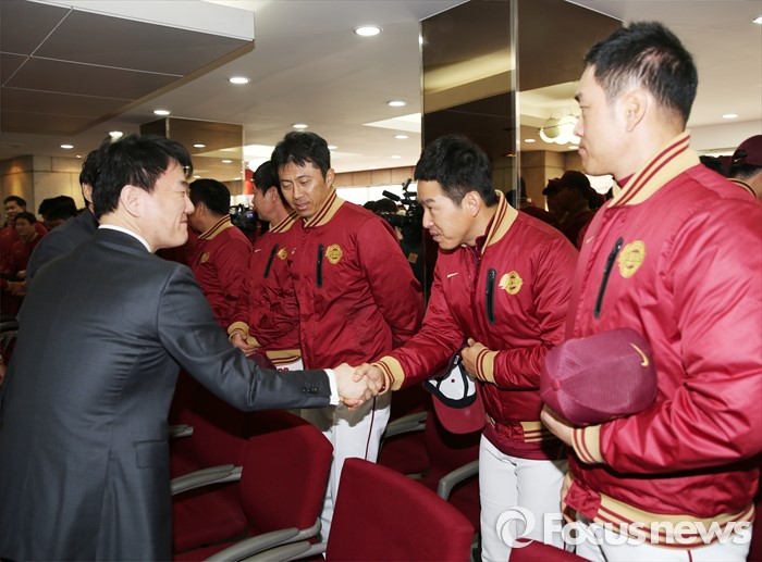 (서울=포커스뉴스) 6일 목동구장에서 열린 프로야구 2016년 넥센 히어로즈 시무식을 마치고 이장석 대표가 코칭스탭과 악수하고 있다.